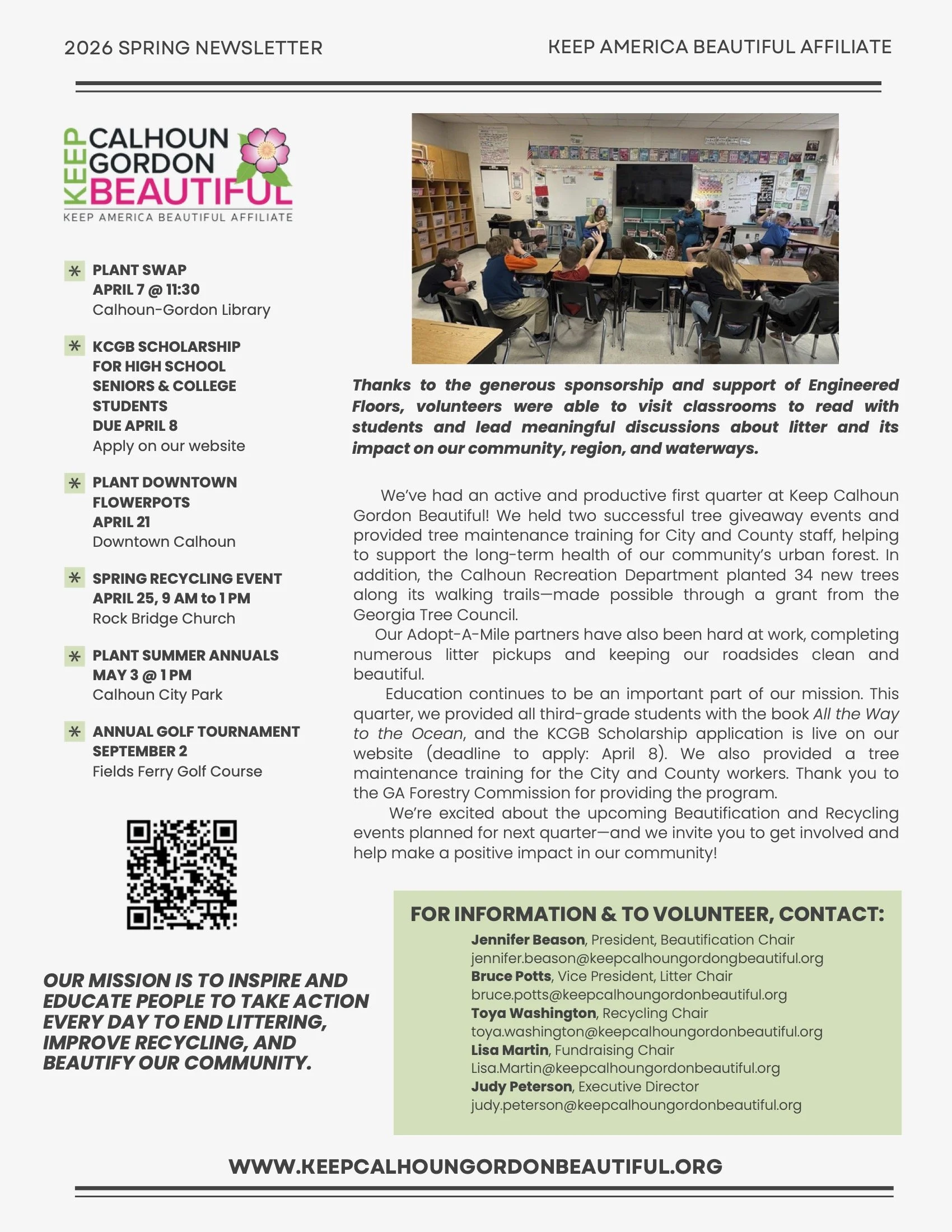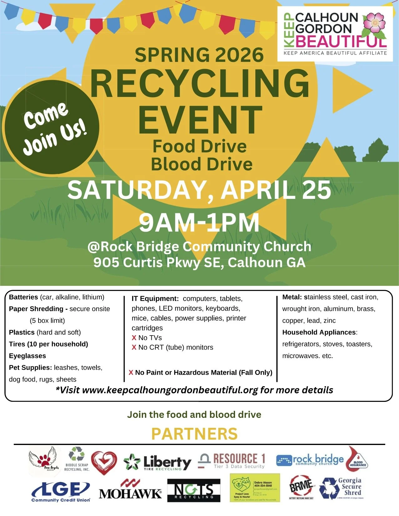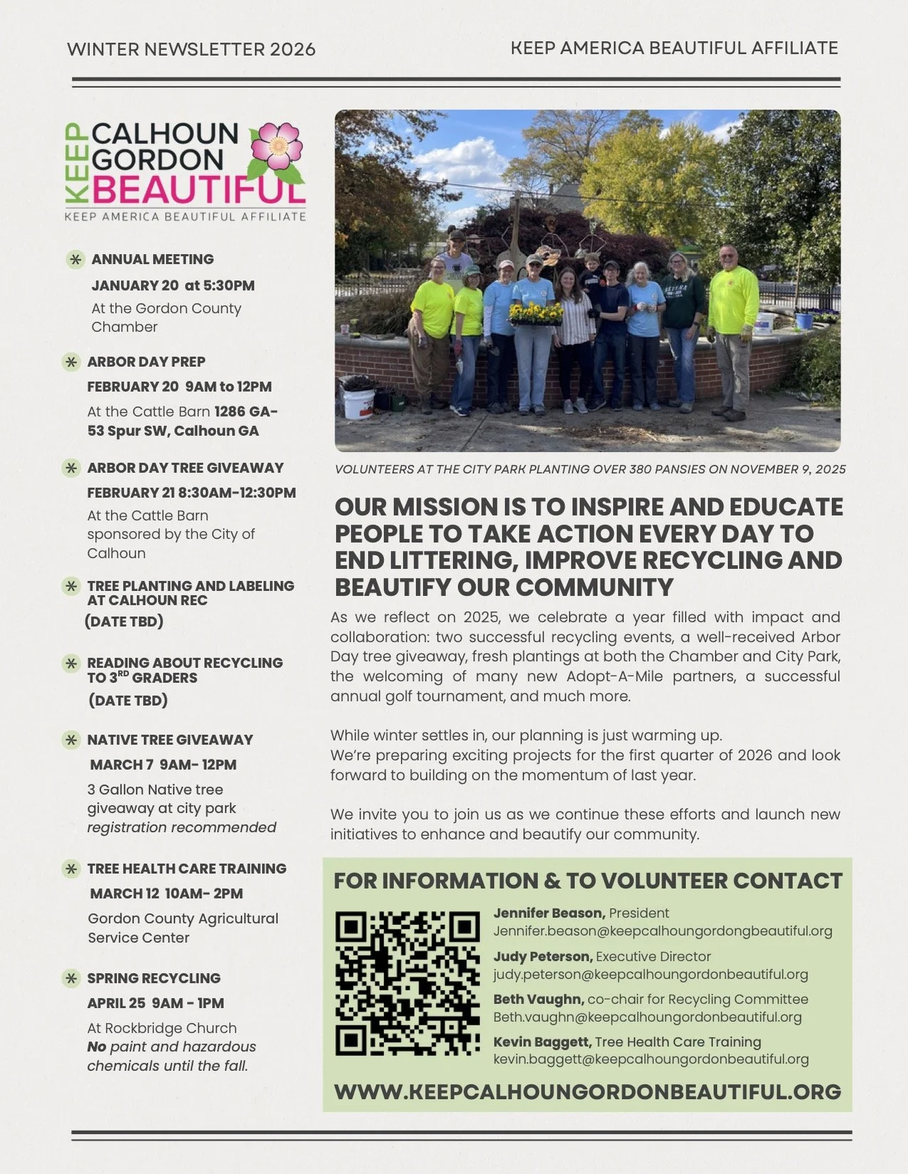 Through education, community events, and partnerships with local schools, church groups, businesses, and local governments, we work year-round make Calhoun and all of Gordon County cleaner and greener.